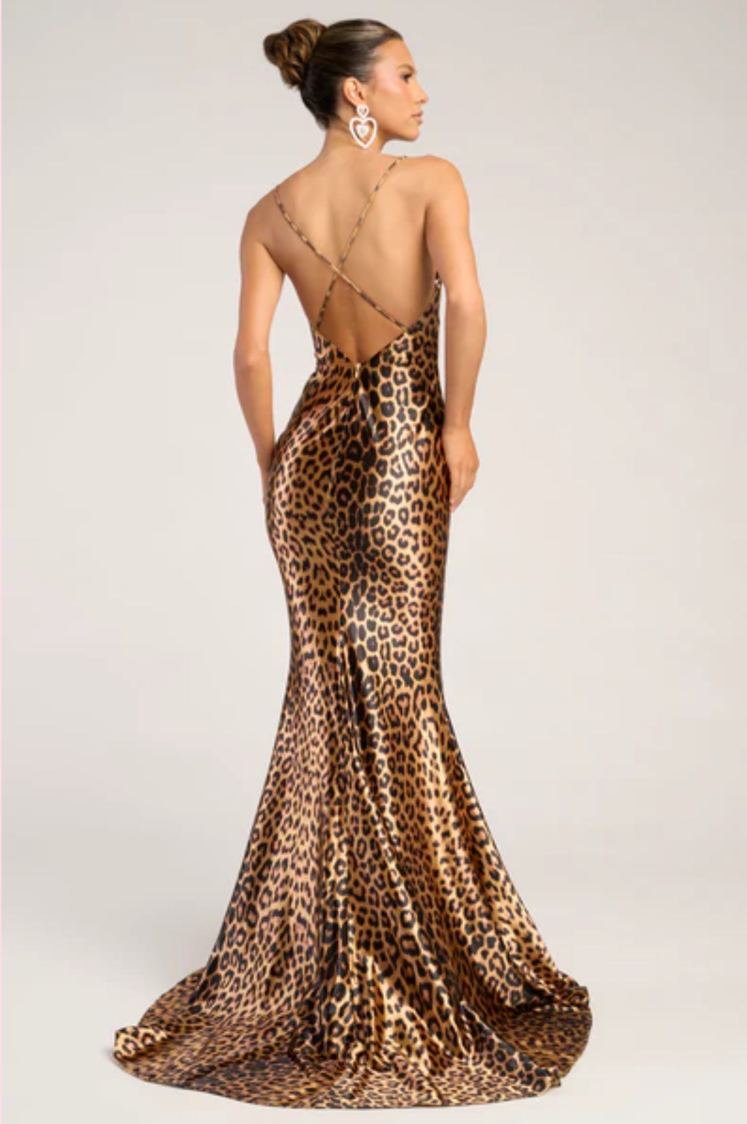 The dress is characterized by a cowl neckline, a fitted bodice that cinches the waist, and an elegant, flowing skirt, and a trumpet hem. It has thin, adjustable straps and an open back.
