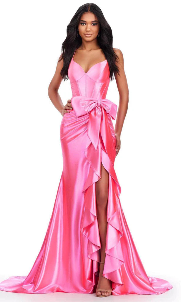 This shimmer jersey gown features a corset bodice with a bow and cascading ruffle detail. The lace up back and spaghetti straps make this extra fab.