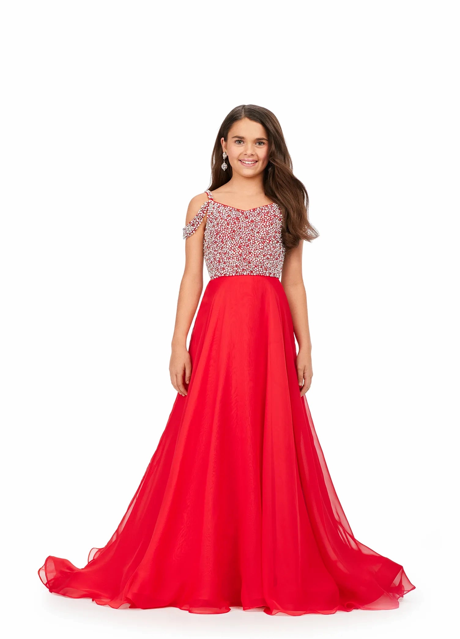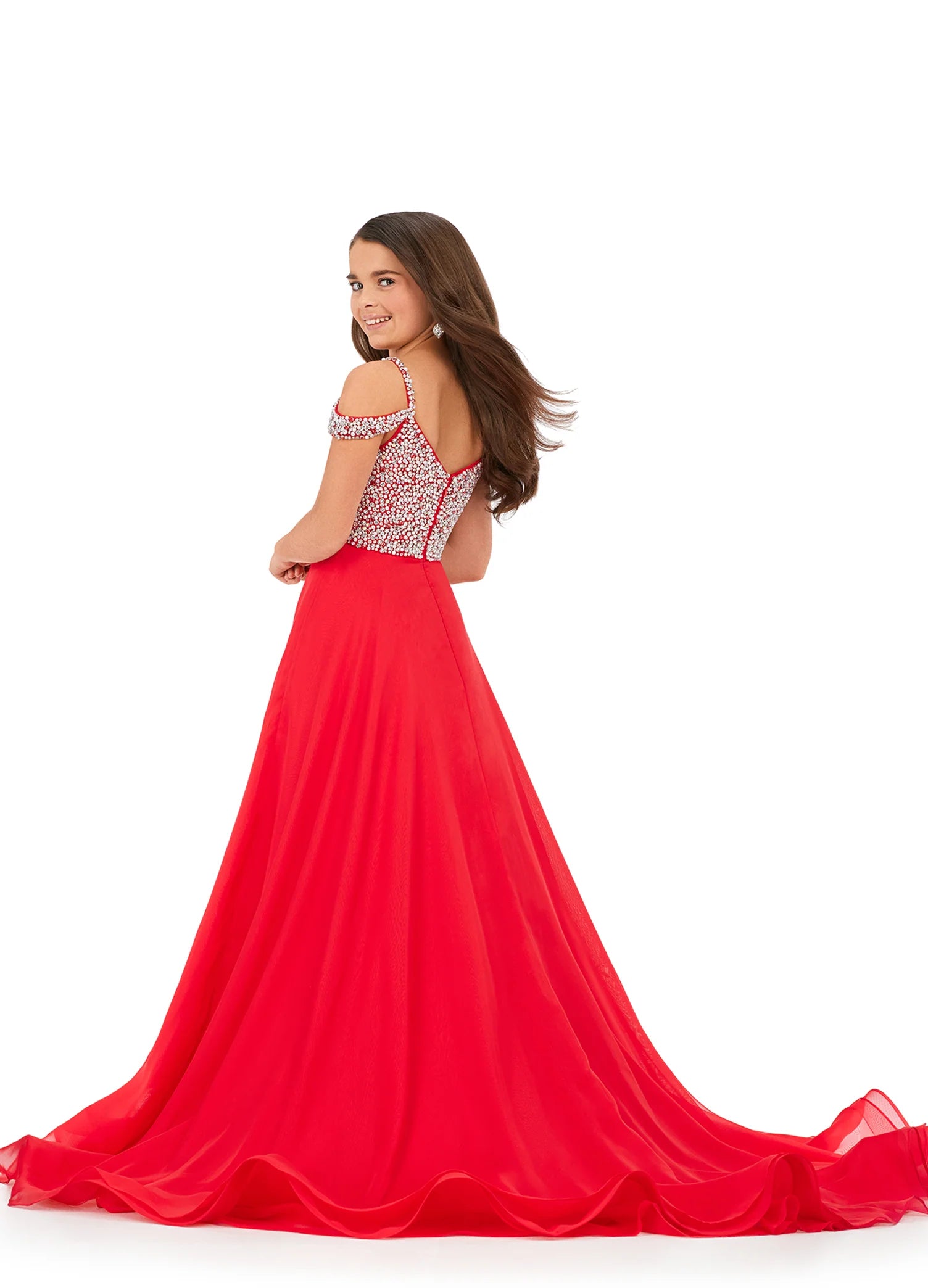 Obsessed with elegance, this gown features a fully beaded off-shoulder bodice, sweetheart neckline, and a flowy chiffon A-line skirt for a stunning look.