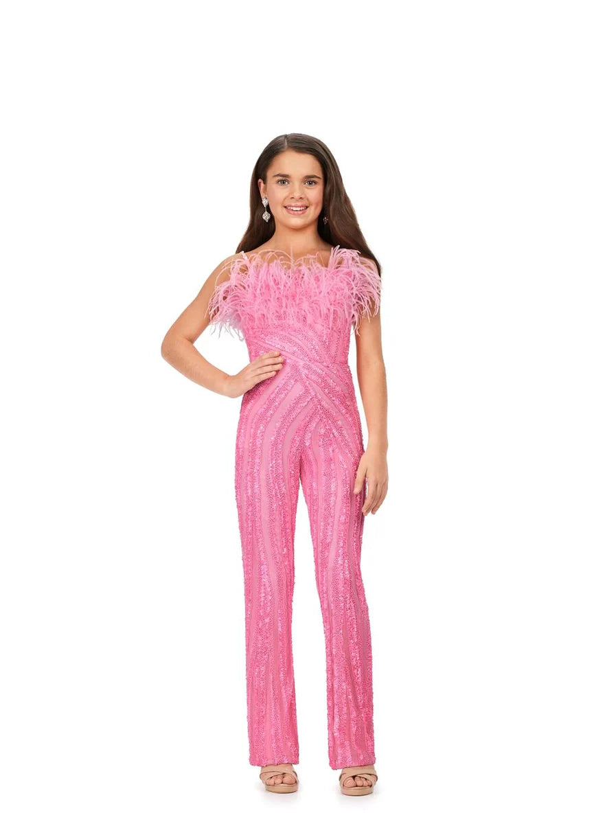 Sparkle in this fabulous sequin jumpsuit! With the intricate bead pattern and pop of feathers along the neckline, this jumpsuit will own the runway!