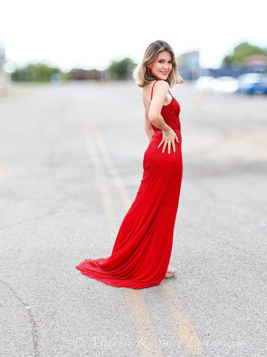 This liquid beaded style features an exposed bustier that is sure to accentuate your curves. The look is complete with sweep train and left leg slit.