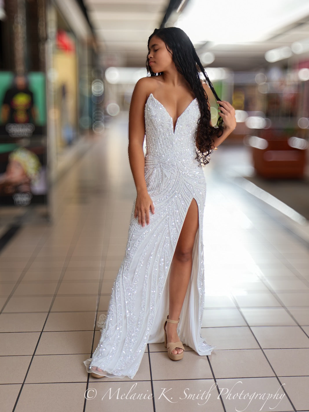 This strapless gown is sure to turn heads. The sweetheart neckline is complete with a modern floral sequin motif that continues down the bustier and skirt. The skirt is complete with a left leg slit.
