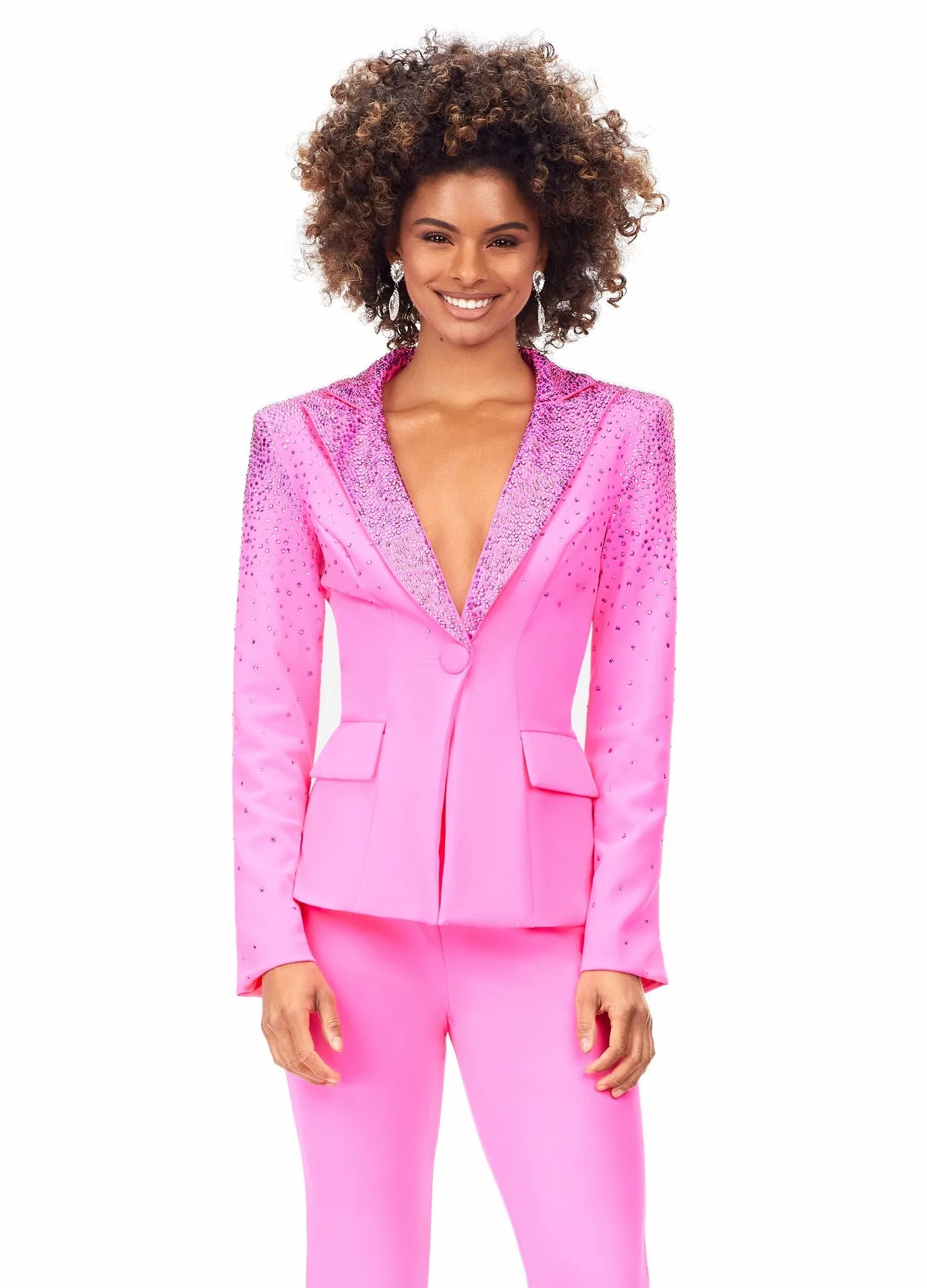 This two piece suit is perfect for your next event. The shoulders and lapel are adorned with press on stones that trickle down the jacket. The pants have a flare leg