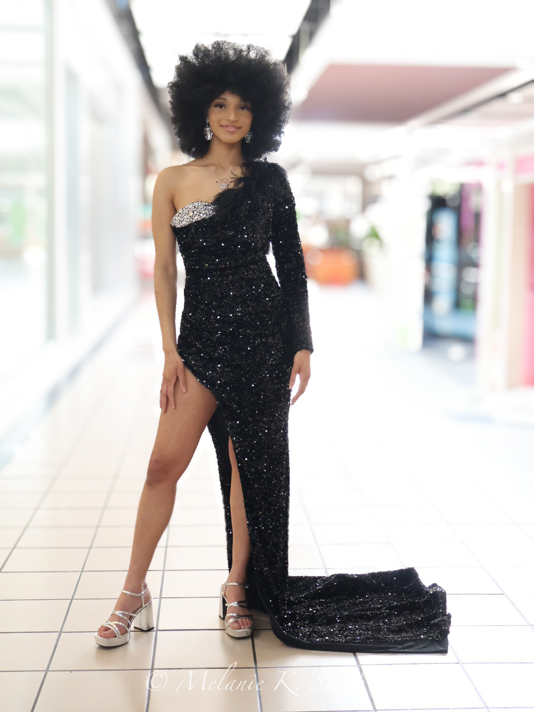 Be the center of attention in this shimmering Portia and Scarlett evening dress. This dress is tailored in velvet fabric embellished with shimmering sequins and feathers. Features a single sleeve style with a sweetheart neckline. The skirt features a floor length hi low silhouette and ends with a sweep train. As you make a striking entry in this Portia and Scarlett PS23647 creation, you will exude a new sense of flair. The model is wearing the Black color.