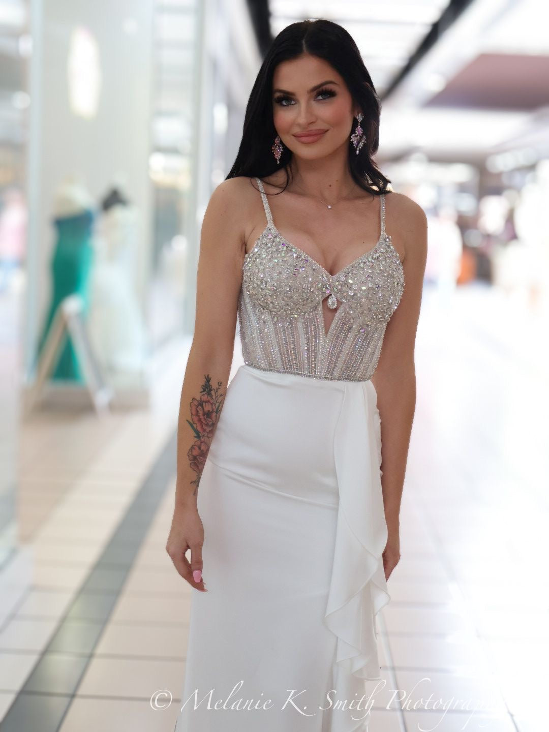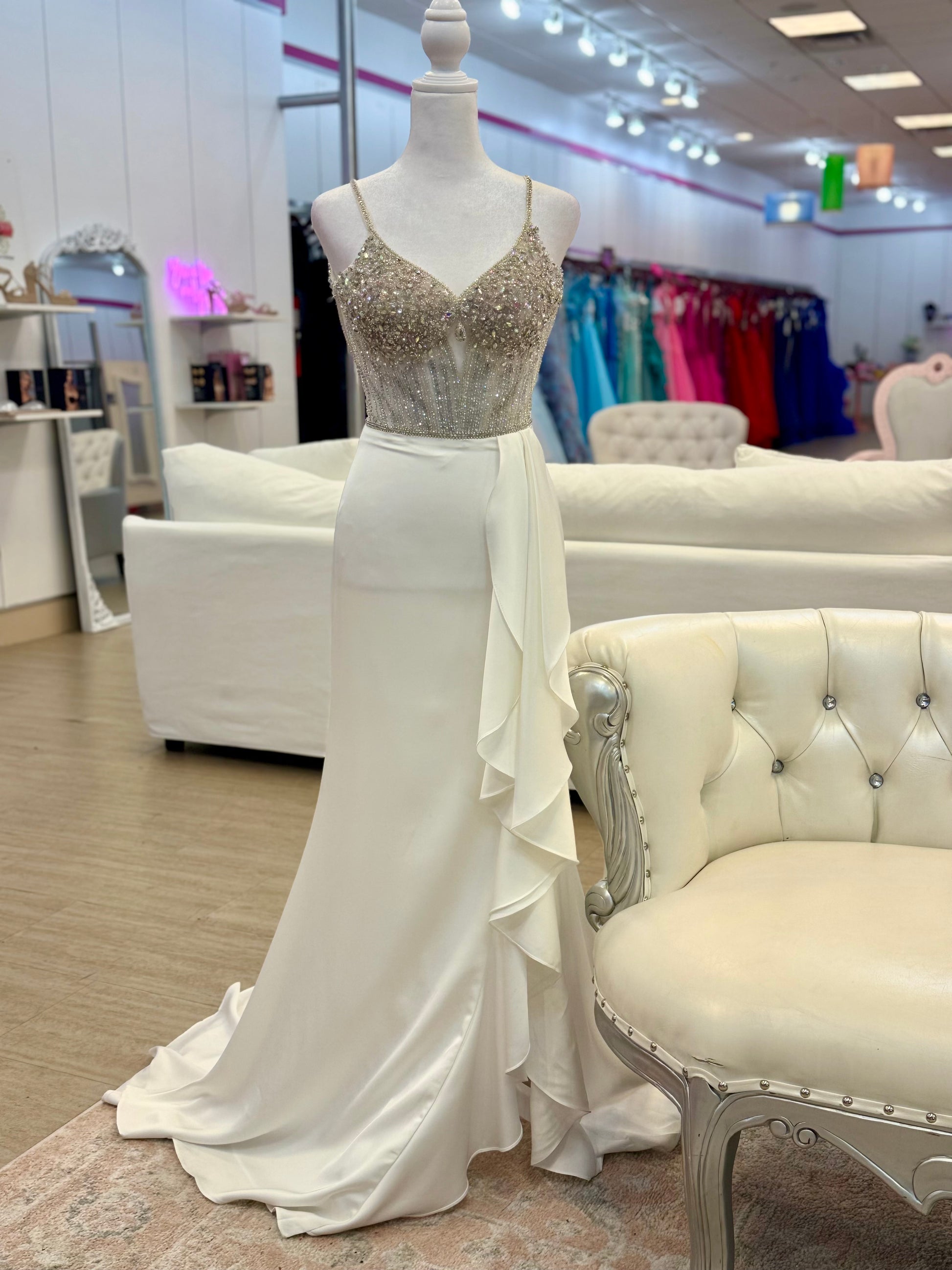 A beaded bodice paired with a silk skirt featuring a ruffled slit and adorned with a rose for detail. This dress has no stretch.