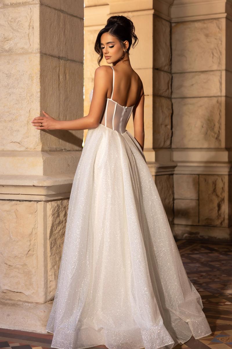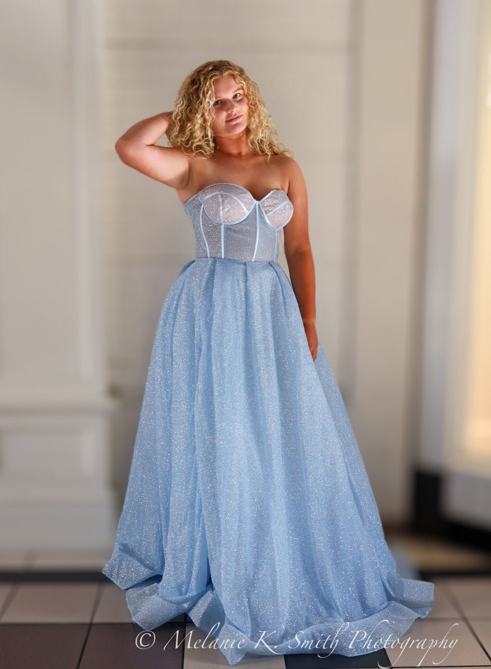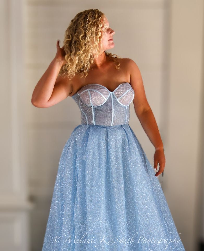 Glisten the night away at prom in this sparkling Portia and Scarlett ball gown made in shimmering glitter tulle. This stellar gown features an illusion corset bodice with visible structured boning, sweetheart neckline, strapless and zipper closure back. The a line, long skirt has a front side slit and horsehair hem edge. Note. Gown does not have straps.